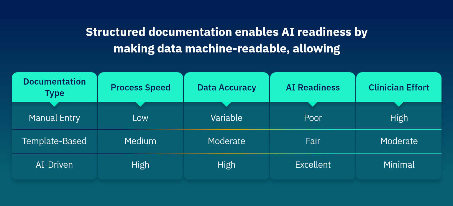 Most patient interactions still generate unstructured data such as free-text notes, dictations, or transcripts. Without structure, even advanced analytics or AI tools can’t fully use these insights. Structured documentation enables AI readiness by making data machine-readable, allowing: