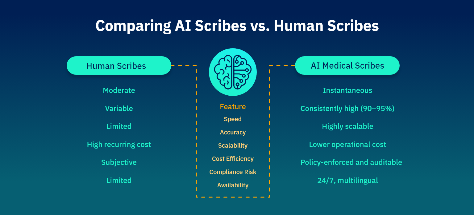 AI scribes offer scalability and consistency that human scribes cannot match, though complex cases may still benefit from human oversight. The future of clinical documentation automation lies in hybrid models where AI handles routine tasks, and humans verify clinical nuance.