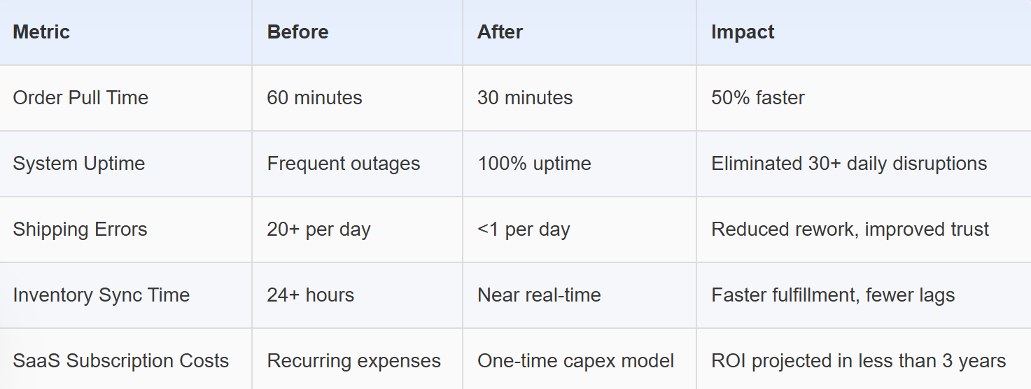 Manual processes for inventory management and order handling added to operational overheads, and the system struggled to keep pace with growing order volumes. This reliance on outdated tools limited the company’s ability to deliver seamless services and remain competitive in the fast‑moving eCommerce sector.