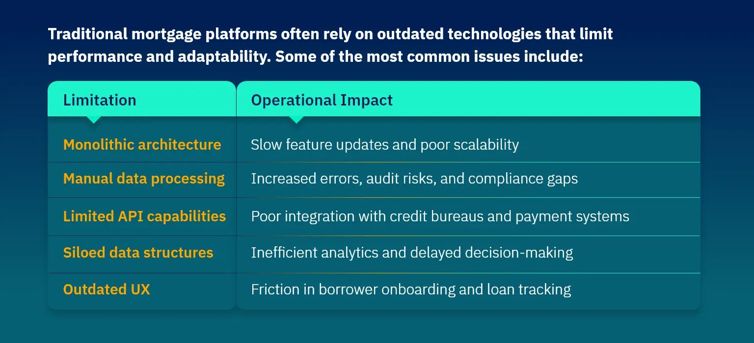 Traditional mortgage platforms often rely on outdated technologies that limit performance and adaptability. Some of the most common issues include